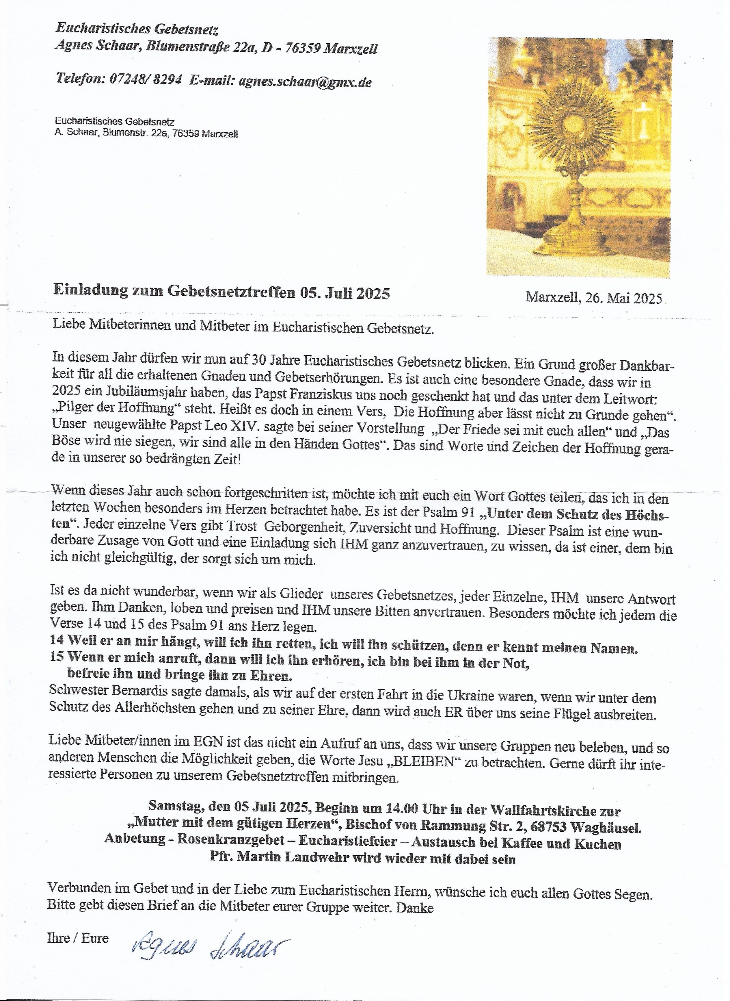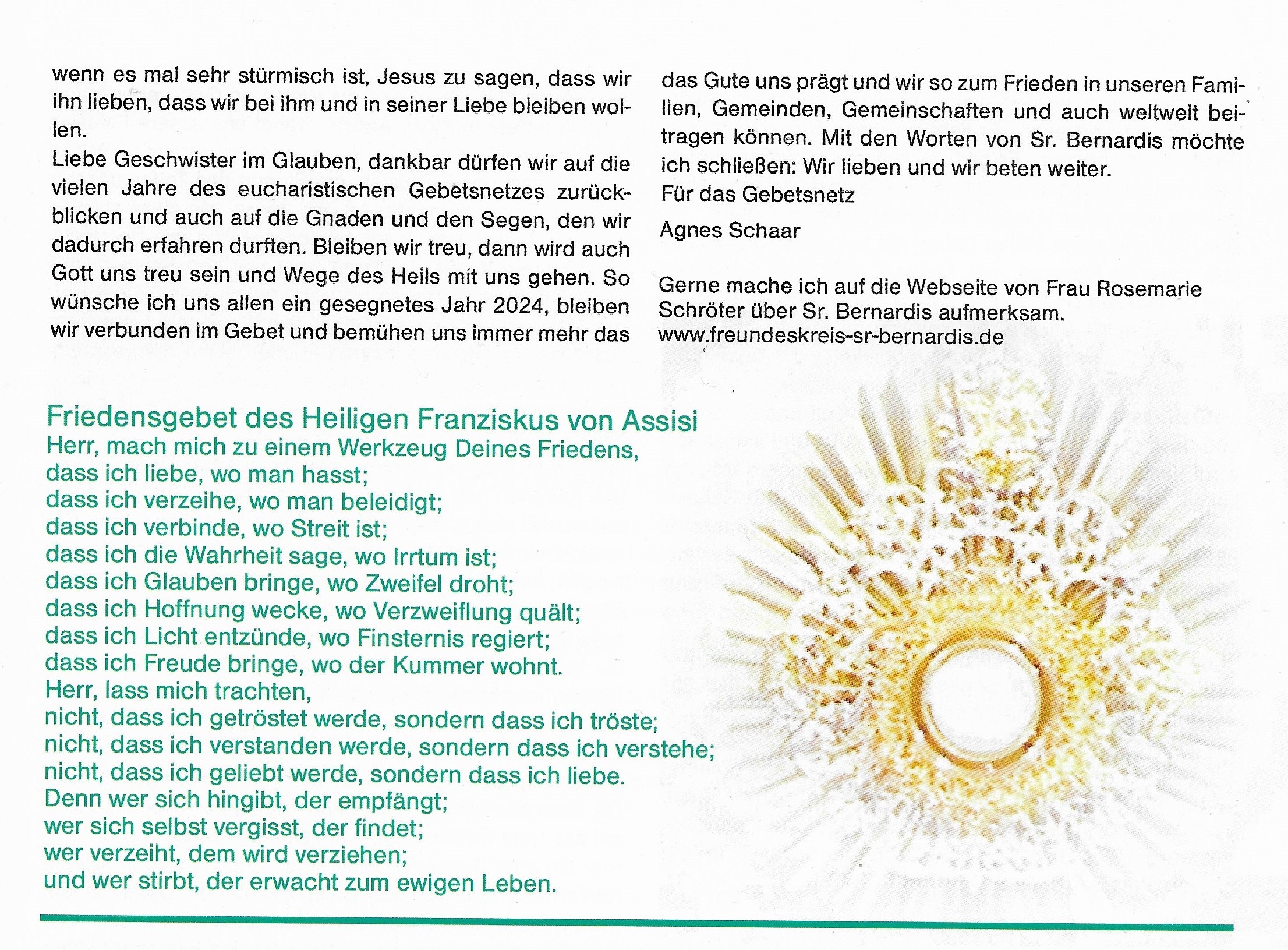 Für das Eucharistische Gebetsnetz Agnes Schaar